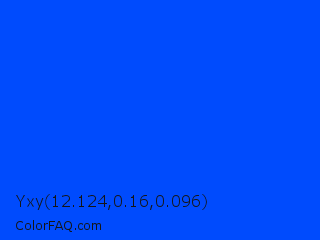 Yxy 12.124,0.16,0.096 Color is a normal blue color and the nearest color is Blue RYB #0247fe. Hex code #004bfd and RGB value is rgb(0,75,253). In RGB color space, this color is composed of 0% red, 29% green, 99% blue, In CMYK color space, this color is composed of 100% cyan, 70% magenta, 0% yellow , 1% black , In HSL color space, this color has a hue angle of 222° , 100% saturation and 50% lightness.