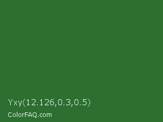 Yxy 12.126,0.3,0.5 Color is a dark green color and the nearest color is Mughal Green #306030. Hex code #2c6f31 and RGB value is rgb(44,111,49). In RGB color space, this color is composed of 17% red, 44% green, 19% blue, In CMYK color space, this color is composed of 60% cyan, 0% magenta, 56% yellow , 56% black , In HSL color space, this color has a hue angle of 124° , 43% saturation and 30% lightness.