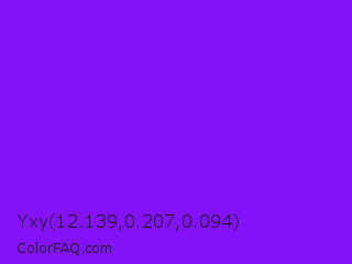 Yxy 12.139,0.207,0.094 Color is a normal violet color and the nearest color is Violet Color Wheel #7f00ff. Hex code #8412f9 and RGB value is rgb(132,18,249). In RGB color space, this color is composed of 52% red, 7% green, 98% blue, In CMYK color space, this color is composed of 47% cyan, 93% magenta, 0% yellow , 2% black , In HSL color space, this color has a hue angle of 270° , 95% saturation and 52% lightness.