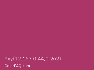 Yxy 12.163,0.44,0.262 Color is a normal rose color and the nearest color is Rich Maroon #b03060. Hex code #ab3566 and RGB value is rgb(171,53,102). In RGB color space, this color is composed of 67% red, 21% green, 40% blue, In CMYK color space, this color is composed of 0% cyan, 69% magenta, 40% yellow , 33% black , In HSL color space, this color has a hue angle of 335° , 53% saturation and 44% lightness.