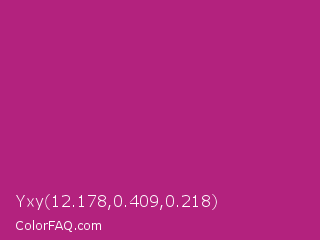 Yxy 12.178,0.409,0.218 Color is a normal magenta color and the nearest color is Medium Red Violet #bb3385. Hex code #b3227e and RGB value is rgb(179,34,126). In RGB color space, this color is composed of 70% red, 13% green, 49% blue, In CMYK color space, this color is composed of 0% cyan, 81% magenta, 30% yellow , 30% black , In HSL color space, this color has a hue angle of 322° , 68% saturation and 42% lightness.