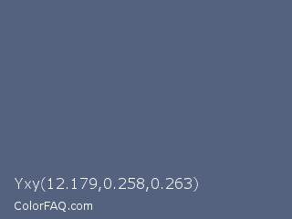 Yxy 12.179,0.258,0.263 Color is a normal blue color and the nearest color is Paynes Grey #536878. Hex code #546280 and RGB value is rgb(84,98,128). In RGB color space, this color is composed of 33% red, 38% green, 50% blue, In CMYK color space, this color is composed of 34% cyan, 23% magenta, 0% yellow , 50% black , In HSL color space, this color has a hue angle of 221° , 21% saturation and 42% lightness.