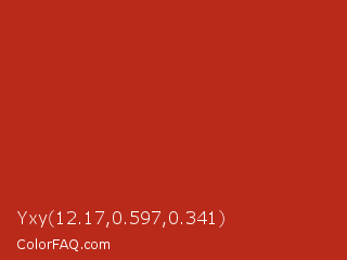 Yxy 12.17,0.597,0.341 Color is a normal red color and the nearest color is Thunderbird #c02b18. Hex code #ba2a1a and RGB value is rgb(186,42,26). In RGB color space, this color is composed of 73% red, 16% green, 10% blue, In CMYK color space, this color is composed of 0% cyan, 77% magenta, 86% yellow , 27% black , In HSL color space, this color has a hue angle of 6° , 75% saturation and 42% lightness.