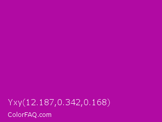 Yxy 12.187,0.342,0.168 Color is a normal magenta color and the nearest color is Violet Eggplant #991199. Hex code #b10aa3 and RGB value is rgb(177,10,163). In RGB color space, this color is composed of 69% red, 4% green, 64% blue, In CMYK color space, this color is composed of 0% cyan, 94% magenta, 8% yellow , 31% black , In HSL color space, this color has a hue angle of 305° , 89% saturation and 37% lightness.