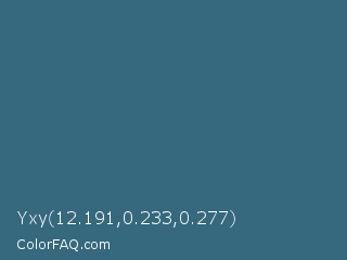 Yxy 12.191,0.233,0.277 Color is a normal blue color and the nearest color is Ming #36747d. Hex code #36687e and RGB value is rgb(54,104,126). In RGB color space, this color is composed of 21% red, 41% green, 49% blue, In CMYK color space, this color is composed of 57% cyan, 17% magenta, 0% yellow , 51% black , In HSL color space, this color has a hue angle of 198° , 40% saturation and 35% lightness.
