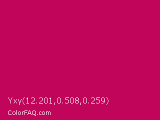 Yxy 12.201,0.508,0.259 Color is a normal rose color and the nearest color is Pictorial Carmine #c30b4e. Hex code #c1055b and RGB value is rgb(193,5,91). In RGB color space, this color is composed of 76% red, 2% green, 36% blue, In CMYK color space, this color is composed of 0% cyan, 97% magenta, 53% yellow , 24% black , In HSL color space, this color has a hue angle of 333° , 95% saturation and 39% lightness.