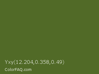 Yxy 12.204,0.358,0.49 Color is a dark green color and the nearest color is Dark Olive Green #556b2f. Hex code #516a27 and RGB value is rgb(81,106,39). In RGB color space, this color is composed of 32% red, 42% green, 15% blue, In CMYK color space, this color is composed of 24% cyan, 0% magenta, 63% yellow , 58% black , In HSL color space, this color has a hue angle of 82° , 46% saturation and 28% lightness.