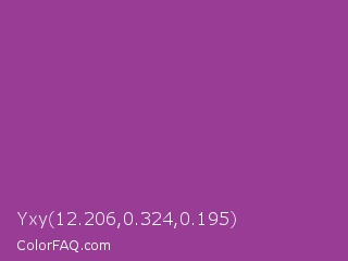 Yxy 12.206,0.324,0.195 Color is a normal magenta color and the nearest color is Plum #8e4585. Hex code #993c96 and RGB value is rgb(153,60,150). In RGB color space, this color is composed of 60% red, 24% green, 59% blue, In CMYK color space, this color is composed of 0% cyan, 61% magenta, 2% yellow , 40% black , In HSL color space, this color has a hue angle of 302° , 44% saturation and 42% lightness.