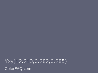 Yxy 12.213,0.282,0.285 Color is a normal blue color and the nearest color is Comet #5c5d75. Hex code #5e6175 and RGB value is rgb(94,97,117). In RGB color space, this color is composed of 37% red, 38% green, 46% blue, In CMYK color space, this color is composed of 20% cyan, 17% magenta, 0% yellow , 54% black , In HSL color space, this color has a hue angle of 232° , 11% saturation and 41% lightness.