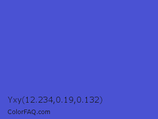Yxy 12.234,0.19,0.132 Color is a normal blue color and the nearest color is Iris #5a4fcf. Hex code #4a52d3 and RGB value is rgb(74,82,211). In RGB color space, this color is composed of 29% red, 32% green, 83% blue, In CMYK color space, this color is composed of 65% cyan, 61% magenta, 0% yellow , 17% black , In HSL color space, this color has a hue angle of 236° , 61% saturation and 56% lightness.
