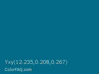 Yxy 12.235,0.208,0.267 Color is a dark cyan color and the nearest color is Orient #015e85. Hex code #036b85 and RGB value is rgb(3,107,133). In RGB color space, this color is composed of 1% red, 42% green, 52% blue, In CMYK color space, this color is composed of 98% cyan, 20% magenta, 0% yellow , 48% black , In HSL color space, this color has a hue angle of 192° , 96% saturation and 27% lightness.