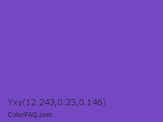 Yxy 12.243,0.23,0.146 Color is a normal violet color and the nearest color is Studio #714ab2. Hex code #7448c2 and RGB value is rgb(116,72,194). In RGB color space, this color is composed of 45% red, 28% green, 76% blue, In CMYK color space, this color is composed of 40% cyan, 63% magenta, 0% yellow , 24% black , In HSL color space, this color has a hue angle of 262° , 50% saturation and 52% lightness.
