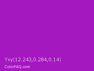 Yxy 12.243,0.284,0.14 Color is a normal purple color and the nearest color is Purple Munsell #9f00c5. Hex code #a319bf and RGB value is rgb(163,25,191). In RGB color space, this color is composed of 64% red, 10% green, 75% blue, In CMYK color space, this color is composed of 15% cyan, 87% magenta, 0% yellow , 25% black , In HSL color space, this color has a hue angle of 290° , 77% saturation and 42% lightness.