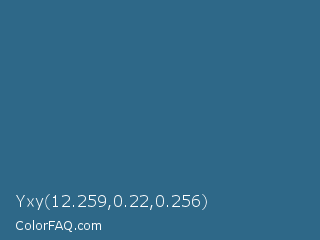 Yxy 12.259,0.22,0.256 Color is a normal blue color and the nearest color is Calypso #31728d. Hex code #2e6888 and RGB value is rgb(46,104,136). In RGB color space, this color is composed of 18% red, 41% green, 53% blue, In CMYK color space, this color is composed of 66% cyan, 24% magenta, 0% yellow , 47% black , In HSL color space, this color has a hue angle of 201° , 49% saturation and 36% lightness.