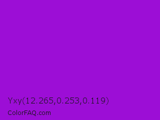 Yxy 12.265,0.253,0.119 Color is a normal purple color and the nearest color is Dark Violet #9400d3. Hex code #9c0ed6 and RGB value is rgb(156,14,214). In RGB color space, this color is composed of 61% red, 5% green, 84% blue, In CMYK color space, this color is composed of 27% cyan, 93% magenta, 0% yellow , 16% black , In HSL color space, this color has a hue angle of 283° , 88% saturation and 45% lightness.