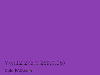 Yxy 12.275,0.269,0.16 Color is a normal purple color and the nearest color is Purpureus #9a4eae. Hex code #8c3eb3 and RGB value is rgb(140,62,179). In RGB color space, this color is composed of 55% red, 24% green, 70% blue, In CMYK color space, this color is composed of 22% cyan, 65% magenta, 0% yellow , 30% black , In HSL color space, this color has a hue angle of 280° , 49% saturation and 47% lightness.