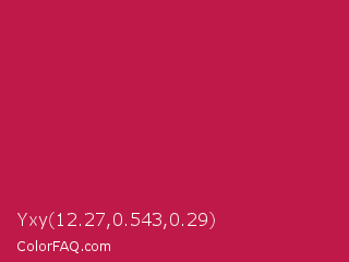 Yxy 12.27,0.543,0.29 Color is a normal rose color and the nearest color is Maroon Flush #c32148. Hex code #bf1a47 and RGB value is rgb(191,26,71). In RGB color space, this color is composed of 75% red, 10% green, 28% blue, In CMYK color space, this color is composed of 0% cyan, 86% magenta, 63% yellow , 25% black , In HSL color space, this color has a hue angle of 344° , 76% saturation and 43% lightness.