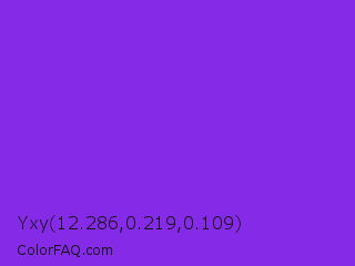 Yxy 12.286,0.219,0.109 Color is a normal violet color and the nearest color is Blue Violet #8a2be2. Hex code #852ae6 and RGB value is rgb(133,42,230). In RGB color space, this color is composed of 52% red, 16% green, 90% blue, In CMYK color space, this color is composed of 42% cyan, 82% magenta, 0% yellow , 10% black , In HSL color space, this color has a hue angle of 269° , 79% saturation and 53% lightness.