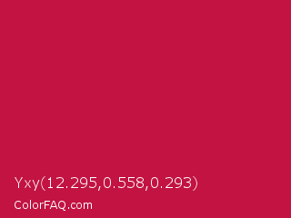 Yxy 12.295,0.558,0.293 Color is a normal rose color and the nearest color is Cardinal #c41e3a. Hex code #c21342 and RGB value is rgb(194,19,66). In RGB color space, this color is composed of 76% red, 7% green, 26% blue, In CMYK color space, this color is composed of 0% cyan, 90% magenta, 66% yellow , 24% black , In HSL color space, this color has a hue angle of 344° , 82% saturation and 42% lightness.