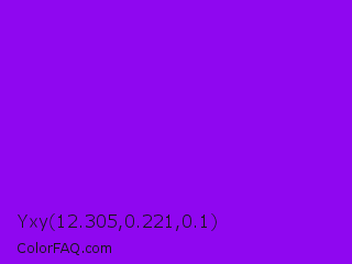 Yxy 12.305,0.221,0.1 Color is a normal purple color and the nearest color is Electric Violet #8f00ff. Hex code #8f07f0 and RGB value is rgb(143,7,240). In RGB color space, this color is composed of 56% red, 3% green, 94% blue, In CMYK color space, this color is composed of 40% cyan, 97% magenta, 0% yellow , 6% black , In HSL color space, this color has a hue angle of 275° , 94% saturation and 48% lightness.