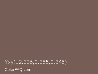 Yxy 12.336,0.365,0.346 Color is a normal color and the nearest color is Russett #755a57. Hex code #765d55 and RGB value is rgb(118,93,85). In RGB color space, this color is composed of 46% red, 36% green, 33% blue, In CMYK color space, this color is composed of 0% cyan, 21% magenta, 28% yellow , 54% black , In HSL color space, this color has a hue angle of 15° , 16% saturation and 40% lightness.