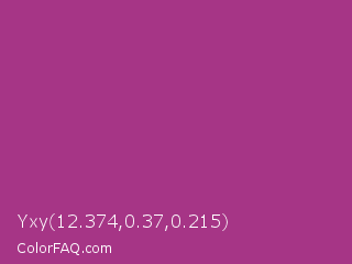 Yxy 12.374,0.37,0.215 Color is a normal magenta color and the nearest color is Maximum Red Purple #a63a79. Hex code #a63586 and RGB value is rgb(166,53,134). In RGB color space, this color is composed of 65% red, 21% green, 53% blue, In CMYK color space, this color is composed of 0% cyan, 68% magenta, 19% yellow , 35% black , In HSL color space, this color has a hue angle of 317° , 52% saturation and 43% lightness.