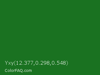 Yxy 12.377,0.298,0.548 Color is a dark green color and the nearest color is La Salle Green #087830. Hex code #1a7221 and RGB value is rgb(26,114,33). In RGB color space, this color is composed of 10% red, 45% green, 13% blue, In CMYK color space, this color is composed of 77% cyan, 0% magenta, 71% yellow , 55% black , In HSL color space, this color has a hue angle of 125° , 63% saturation and 27% lightness.
