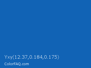 Yxy 12.37,0.184,0.175 Color is a normal blue color and the nearest color is Green Blue #1164b4. Hex code #1163b5 and RGB value is rgb(17,99,181). In RGB color space, this color is composed of 7% red, 39% green, 71% blue, In CMYK color space, this color is composed of 91% cyan, 45% magenta, 0% yellow , 29% black , In HSL color space, this color has a hue angle of 210° , 83% saturation and 39% lightness.