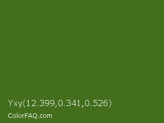 Yxy 12.399,0.341,0.526 Color is a dark green color and the nearest color is Green Leaf #436a0d. Hex code #426e1d and RGB value is rgb(66,110,29). In RGB color space, this color is composed of 26% red, 43% green, 11% blue, In CMYK color space, this color is composed of 40% cyan, 0% magenta, 74% yellow , 57% black , In HSL color space, this color has a hue angle of 93° , 58% saturation and 27% lightness.