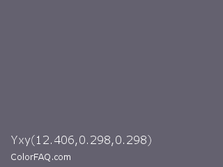 Yxy 12.406,0.298,0.298 Color is a normal indigo color and the nearest color is Salt Box #685e6e. Hex code #64616f and RGB value is rgb(100,97,111). In RGB color space, this color is composed of 39% red, 38% green, 44% blue, In CMYK color space, this color is composed of 10% cyan, 13% magenta, 0% yellow , 56% black , In HSL color space, this color has a hue angle of 253° , 7% saturation and 41% lightness.
