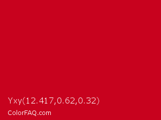 Yxy 12.417,0.62,0.32 Color is a normal red color and the nearest color is Monza #c7031e. Hex code #c8021e and RGB value is rgb(200,2,30). In RGB color space, this color is composed of 78% red, 1% green, 12% blue, In CMYK color space, this color is composed of 0% cyan, 99% magenta, 85% yellow , 22% black , In HSL color space, this color has a hue angle of 352° , 98% saturation and 40% lightness.