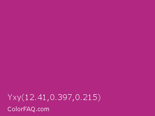 Yxy 12.41,0.397,0.215 Color is a normal magenta color and the nearest color is Fandango #b53389. Hex code #b12782 and RGB value is rgb(177,39,130). In RGB color space, this color is composed of 69% red, 15% green, 51% blue, In CMYK color space, this color is composed of 0% cyan, 78% magenta, 27% yellow , 31% black , In HSL color space, this color has a hue angle of 320° , 64% saturation and 42% lightness.