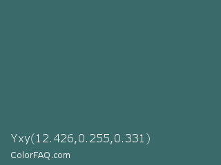 Yxy 12.426,0.255,0.331 Color is a normal cyan color and the nearest color is William #3a686c. Hex code #3a6b6a and RGB value is rgb(58,107,106). In RGB color space, this color is composed of 23% red, 42% green, 42% blue, In CMYK color space, this color is composed of 46% cyan, 0% magenta, 1% yellow , 58% black , In HSL color space, this color has a hue angle of 179° , 30% saturation and 32% lightness.