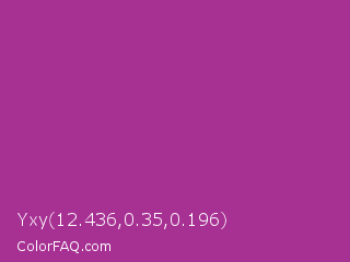 Yxy 12.436,0.35,0.196 Color is a normal magenta color and the nearest color is Fandango #b53389. Hex code #a73093 and RGB value is rgb(167,48,147). In RGB color space, this color is composed of 65% red, 19% green, 58% blue, In CMYK color space, this color is composed of 0% cyan, 71% magenta, 12% yellow , 35% black , In HSL color space, this color has a hue angle of 310° , 55% saturation and 42% lightness.