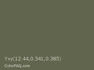 Yxy 12.44,0.341,0.385 Color is a normal yellow color and the nearest color is Finch #626649. Hex code #62654d and RGB value is rgb(98,101,77). In RGB color space, this color is composed of 38% red, 40% green, 30% blue, In CMYK color space, this color is composed of 3% cyan, 0% magenta, 24% yellow , 60% black , In HSL color space, this color has a hue angle of 68° , 13% saturation and 35% lightness.