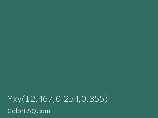 Yxy 12.467,0.254,0.355 Color is a normal cyan color and the nearest color is Casal #2f6168. Hex code #2f6d63 and RGB value is rgb(47,109,99). In RGB color space, this color is composed of 18% red, 43% green, 39% blue, In CMYK color space, this color is composed of 57% cyan, 0% magenta, 9% yellow , 57% black , In HSL color space, this color has a hue angle of 170° , 40% saturation and 31% lightness.