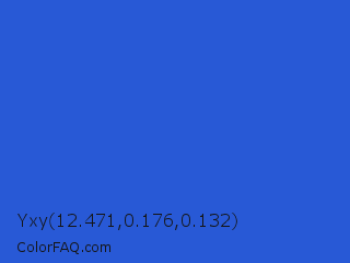 Yxy 12.471,0.176,0.132 Color is a normal blue color and the nearest color is Mariner #286acd. Hex code #2859d6 and RGB value is rgb(40,89,214). In RGB color space, this color is composed of 16% red, 35% green, 84% blue, In CMYK color space, this color is composed of 81% cyan, 58% magenta, 0% yellow , 16% black , In HSL color space, this color has a hue angle of 223° , 69% saturation and 50% lightness.