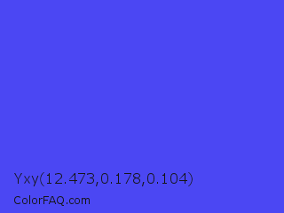 Yxy 12.473,0.178,0.104 Color is a light indigo color and the nearest color is Majorelle Blue #6050dc. Hex code #4b47f3 and RGB value is rgb(75,71,243). In RGB color space, this color is composed of 29% red, 28% green, 95% blue, In CMYK color space, this color is composed of 69% cyan, 71% magenta, 0% yellow , 5% black , In HSL color space, this color has a hue angle of 241° , 88% saturation and 62% lightness.