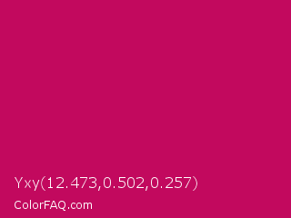 Yxy 12.473,0.502,0.257 Color is a normal rose color and the nearest color is Pictorial Carmine #c30b4e. Hex code #c2095e and RGB value is rgb(194,9,94). In RGB color space, this color is composed of 76% red, 4% green, 37% blue, In CMYK color space, this color is composed of 0% cyan, 95% magenta, 52% yellow , 24% black , In HSL color space, this color has a hue angle of 332° , 91% saturation and 40% lightness.