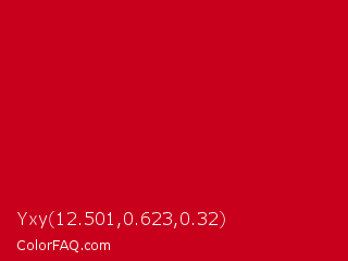 Yxy 12.501,0.623,0.32 Color is a normal red color and the nearest color is Monza #c7031e. Hex code #c9001c and RGB value is rgb(201,0,28). In RGB color space, this color is composed of 79% red, 0% green, 11% blue, In CMYK color space, this color is composed of 0% cyan, 100% magenta, 86% yellow , 21% black , In HSL color space, this color has a hue angle of 352° , 100% saturation and 39% lightness.