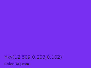 Yxy 12.509,0.203,0.102 Color is a normal violet color and the nearest color is Blue Violet #8a2be2. Hex code #792ff2 and RGB value is rgb(121,47,242). In RGB color space, this color is composed of 47% red, 18% green, 95% blue, In CMYK color space, this color is composed of 50% cyan, 81% magenta, 0% yellow , 5% black , In HSL color space, this color has a hue angle of 263° , 88% saturation and 57% lightness.