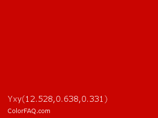 Yxy 12.528,0.638,0.331 Color is a normal red color and the nearest color is Boston University Red #cc0000. Hex code #c90501 and RGB value is rgb(201,5,1). In RGB color space, this color is composed of 79% red, 2% green, 0% blue, In CMYK color space, this color is composed of 0% cyan, 98% magenta, 100% yellow , 21% black , In HSL color space, this color has a hue angle of 1° , 99% saturation and 40% lightness.