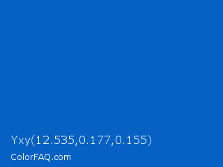 Yxy 12.535,0.177,0.155 Color is a normal blue color and the nearest color is Science Blue #0066cc. Hex code #0661c4 and RGB value is rgb(6,97,196). In RGB color space, this color is composed of 2% red, 38% green, 77% blue, In CMYK color space, this color is composed of 97% cyan, 51% magenta, 0% yellow , 23% black , In HSL color space, this color has a hue angle of 211° , 94% saturation and 40% lightness.