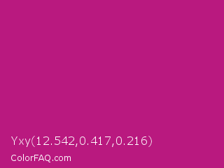 Yxy 12.542,0.417,0.216 Color is a normal magenta color and the nearest color is Red Violet #c71585. Hex code #b9197f and RGB value is rgb(185,25,127). In RGB color space, this color is composed of 73% red, 10% green, 50% blue, In CMYK color space, this color is composed of 0% cyan, 86% magenta, 31% yellow , 27% black , In HSL color space, this color has a hue angle of 322° , 76% saturation and 41% lightness.