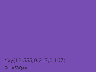 Yxy 12.555,0.247,0.167 Color is a normal violet color and the nearest color is Studio #714ab2. Hex code #784db3 and RGB value is rgb(120,77,179). In RGB color space, this color is composed of 47% red, 30% green, 70% blue, In CMYK color space, this color is composed of 33% cyan, 57% magenta, 0% yellow , 30% black , In HSL color space, this color has a hue angle of 265° , 40% saturation and 50% lightness.