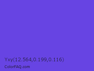 Yxy 12.564,0.199,0.116 Color is a normal indigo color and the nearest color is Majorelle Blue #6050dc. Hex code #6744e3 and RGB value is rgb(103,68,227). In RGB color space, this color is composed of 40% red, 27% green, 89% blue, In CMYK color space, this color is composed of 55% cyan, 70% magenta, 0% yellow , 11% black , In HSL color space, this color has a hue angle of 253° , 74% saturation and 58% lightness.