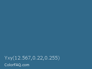 Yxy 12.567,0.22,0.255 Color is a normal blue color and the nearest color is Calypso #31728d. Hex code #30698a and RGB value is rgb(48,105,138). In RGB color space, this color is composed of 19% red, 41% green, 54% blue, In CMYK color space, this color is composed of 65% cyan, 24% magenta, 0% yellow , 46% black , In HSL color space, this color has a hue angle of 202° , 48% saturation and 36% lightness.