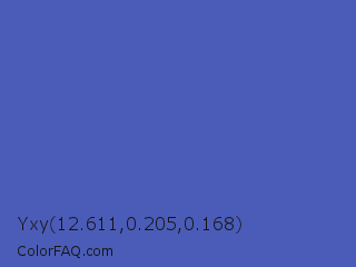 Yxy 12.611,0.205,0.168 Color is a normal blue color and the nearest color is Liberty #545aa7. Hex code #4b5cb8 and RGB value is rgb(75,92,184). In RGB color space, this color is composed of 29% red, 36% green, 72% blue, In CMYK color space, this color is composed of 59% cyan, 50% magenta, 0% yellow , 28% black , In HSL color space, this color has a hue angle of 231° , 43% saturation and 51% lightness.