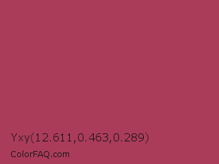 Yxy 12.611,0.463,0.289 Color is a normal rose color and the nearest color is Night Shadz #aa375a. Hex code #ab3c59 and RGB value is rgb(171,60,89). In RGB color space, this color is composed of 67% red, 24% green, 35% blue, In CMYK color space, this color is composed of 0% cyan, 65% magenta, 48% yellow , 33% black , In HSL color space, this color has a hue angle of 344° , 48% saturation and 45% lightness.