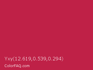 Yxy 12.619,0.539,0.294 Color is a normal red color and the nearest color is Maroon Flush #c32148. Hex code #bf2147 and RGB value is rgb(191,33,71). In RGB color space, this color is composed of 75% red, 13% green, 28% blue, In CMYK color space, this color is composed of 0% cyan, 83% magenta, 63% yellow , 25% black , In HSL color space, this color has a hue angle of 346° , 71% saturation and 44% lightness.